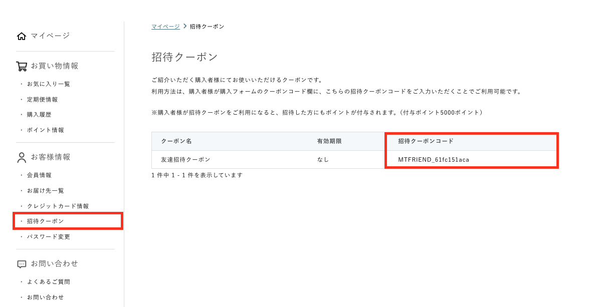 - ②マイページの「招待クーポン」を確認し、コピーする